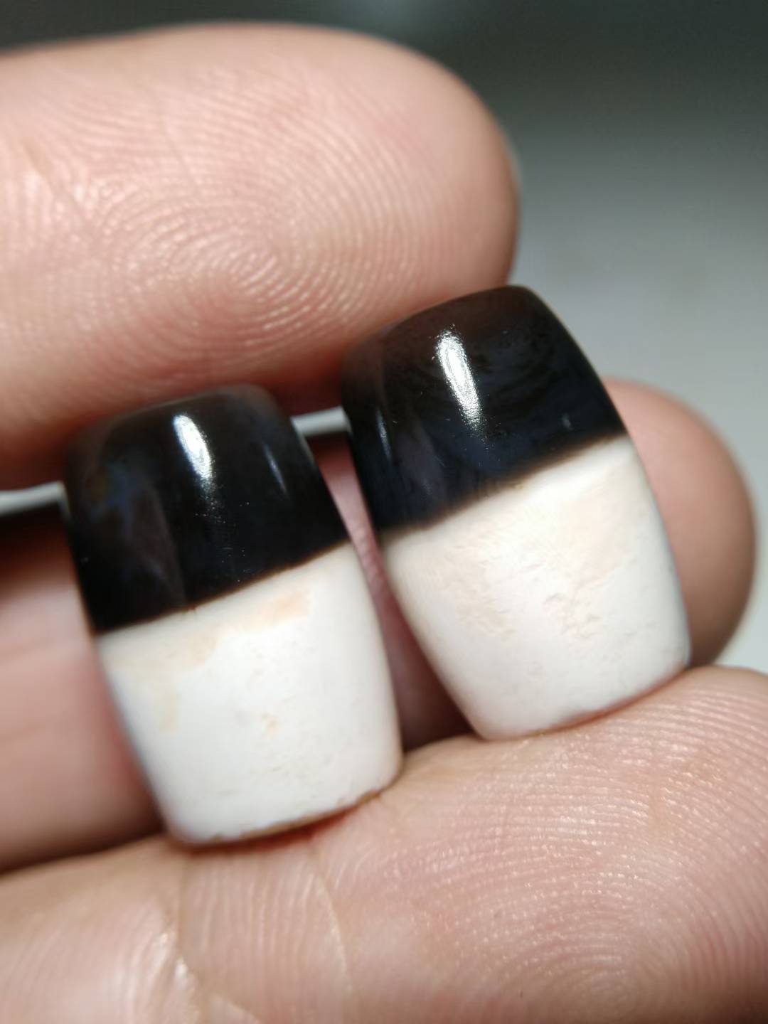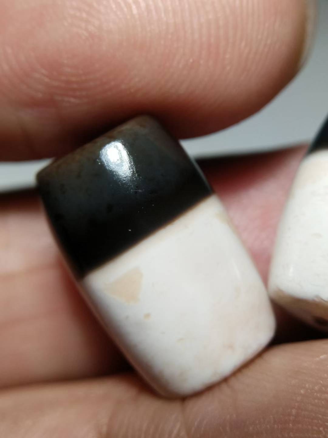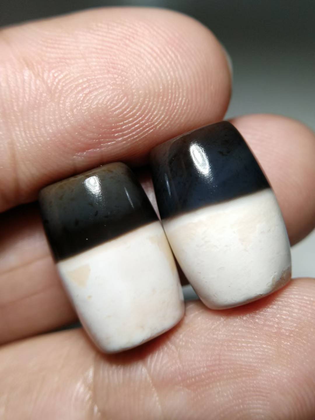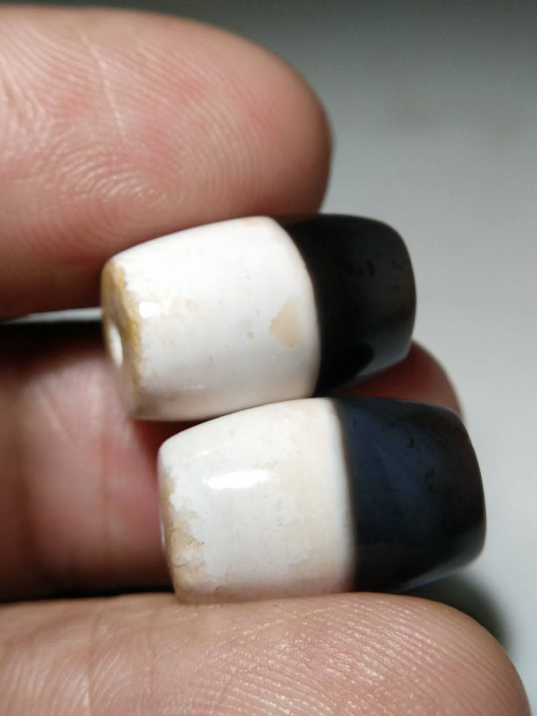 This premium black and white Dzi bead features an exceptionally rich, oily texture and beautifully aged coloration. The black and white hues are sharply contrasted and vividly distinct. Completely opaque under strong light, the bead is hand-polished from naturally weathered old stock material, retaining an organic, freeform shape. The surface displays full, fine matte-finish weathering marks and delicate drag marks (拉丝痕), indicative of age and hand craftsmanship. The patina is thick, smooth, and full-bodied. Dimensions: 11.3 mm × 17 mm.