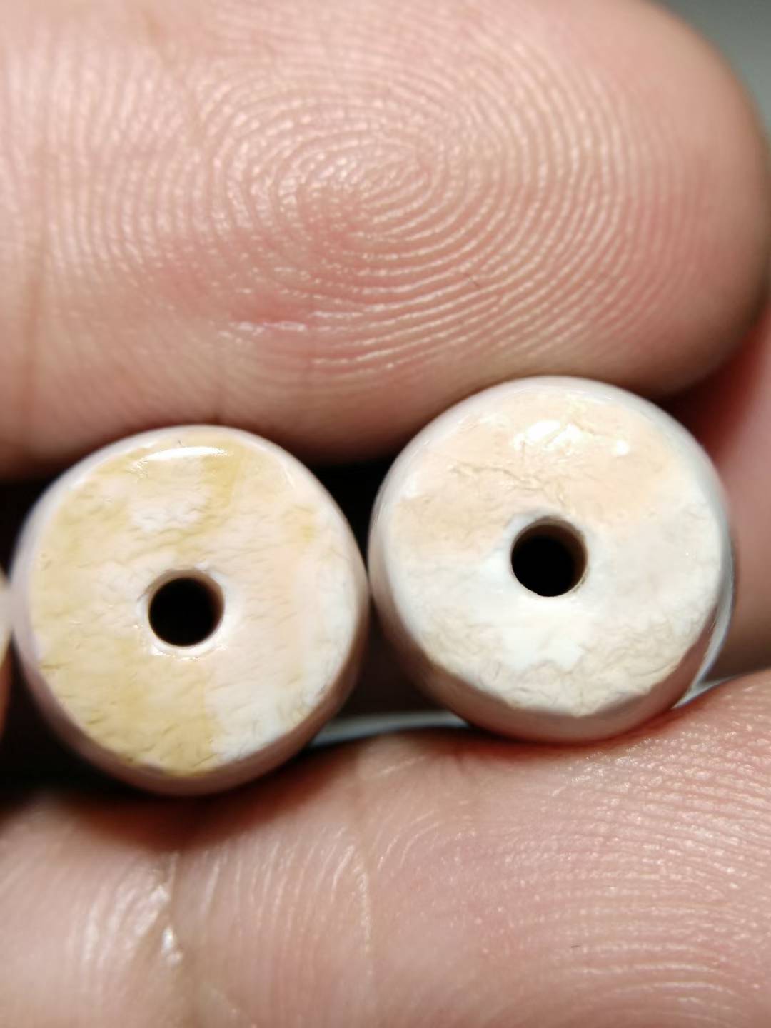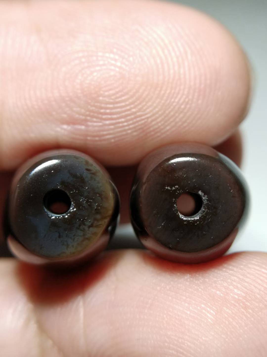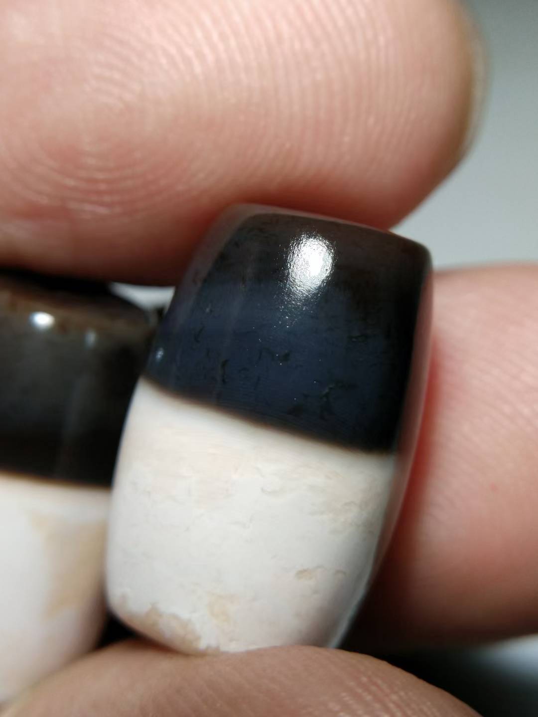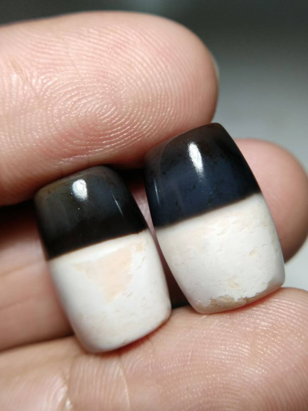 This premium black and white Dzi bead features an exceptionally rich, oily texture and beautifully aged coloration. The black and white hues are sharply contrasted and vividly distinct. Completely opaque under strong light, the bead is hand-polished from naturally weathered old stock material, retaining an organic, freeform shape. The surface displays full, fine matte-finish weathering marks and delicate drag marks (拉丝痕), indicative of age and hand craftsmanship. The patina is thick, smooth, and full-bodied. Dimensions: 11.3 mm × 17 mm.
